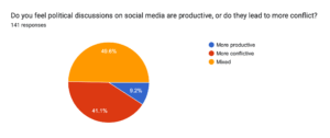 The focus group also emphasized that political discussions on social media often lead to conflict rather than productive conversations. Students 1, 3, and 4 agreed that the productiveness of conversation heavily relied on who the other converser was and the emotional setting. The three students argued that ignorance and political efficacy, among other traits, were determining factors of how productive a conversation would be regarding recent political events – especially on issues like the conflicts in Gaza and Ukraine. The overall tone of the larger body of the focus group came to a consensus at the end of the question that these conversations were more conflictive in their entirety, reinforcing the questionnaire’s finding that 41.1% of students felt online political discussions were more conflict-driven than constructive.